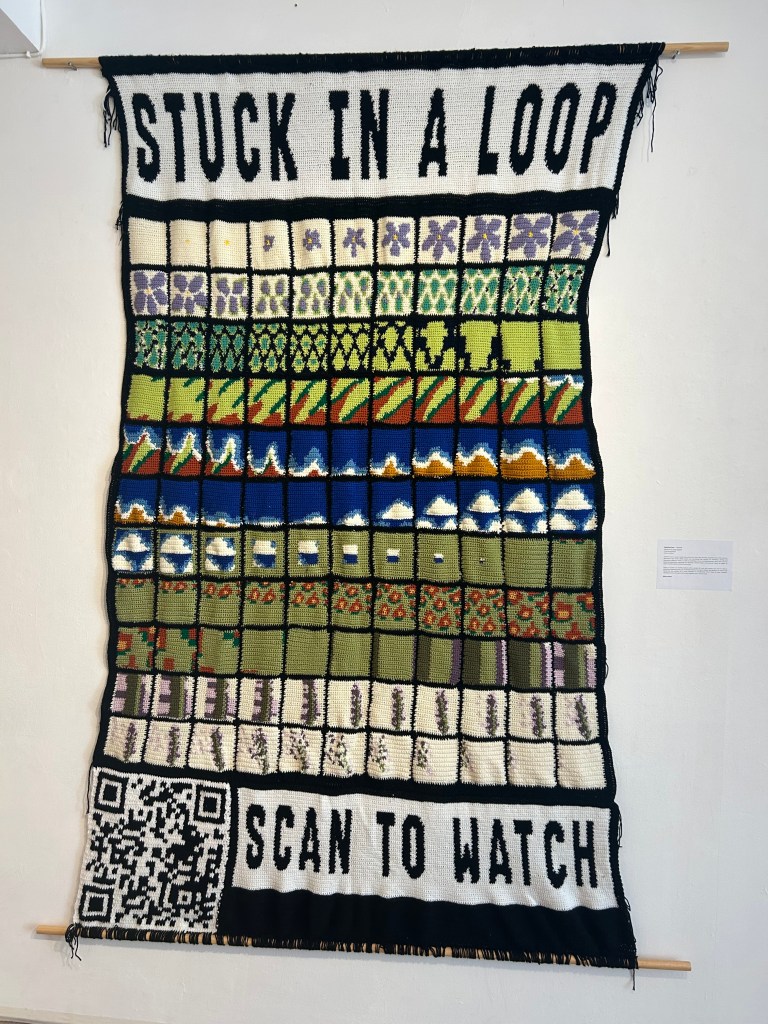 ‘Stuck in a Loop’ is an experimental crochet animation that I made using my final year of university. It is a reflection on the repetitive worries and anxious thoughts that I experience. In a way ‘Stuck in a Loop’ is a manifestation of both how I cope with my anxious thoughts (often through the act of crocheting) and a representation of the looming sense of them at times and how overwhelming they can feel. Embodied in the tapestry is a functional crocheted QR code that you can scan to watch the animation. You can try scanning it through the screen now!